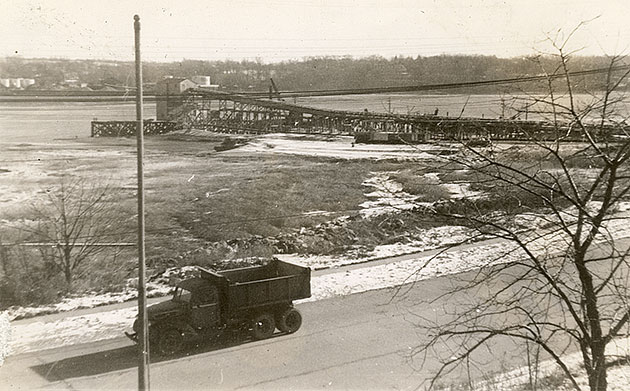 View across the road, showing the conveyor belts which reached out into Hempstead Harbor.